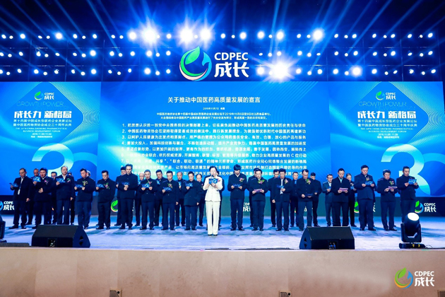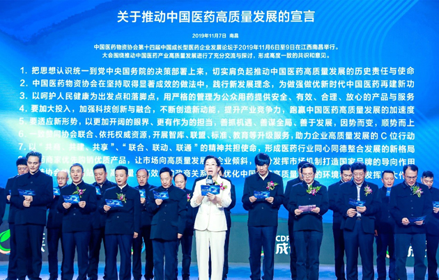 推动中国医药高质量发展,,,,,,,,是第十四届中国成长型医药企业发展论坛的中心任务,,,,,,,,通过充分交流与探讨,,,,,,,,形成高度一致的共识和意见。。。。。。。大会开幕式上,,,,,,,,40位男企业家同着中山装闪亮登场,,,,,,,,在中国医药物资协会副会长、抖圈药业集团董事长刘景萍女士的领读下,,,,,,,,共同隆重发布《关于推动中国医药高质量发展的宣言》,,,,,,,,充分彰显了中国医药企业努力推动医药产业高质量发展的无比自信、坚定信念和磅礴力量。。。。。。。